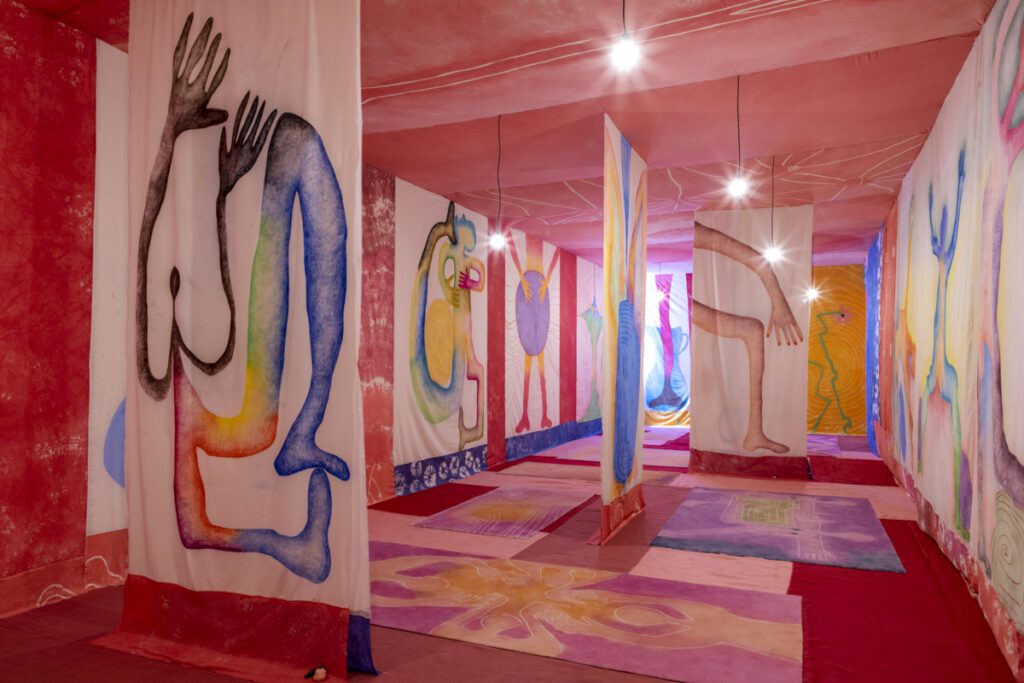 Volume 1: The life of corners, the first manifestation of Celina Eceiza’s ambitious project, A material called Earth, welcomes visitors into an ephemeral architectural space that radically transforms AGB’s Lee-Chin Family Gallery. Made of colourful, hand-dyed, stitched, embroidered textiles and large-scale drawings that cover the walls, floors, and ceilings, the installation’s furnishings invite us to linger, explore, rest, meet, and let our imaginations roam. The work becomes a space of joyous interdependence, with an immersive narrative that toggles between registers, claiming our embodied attention.