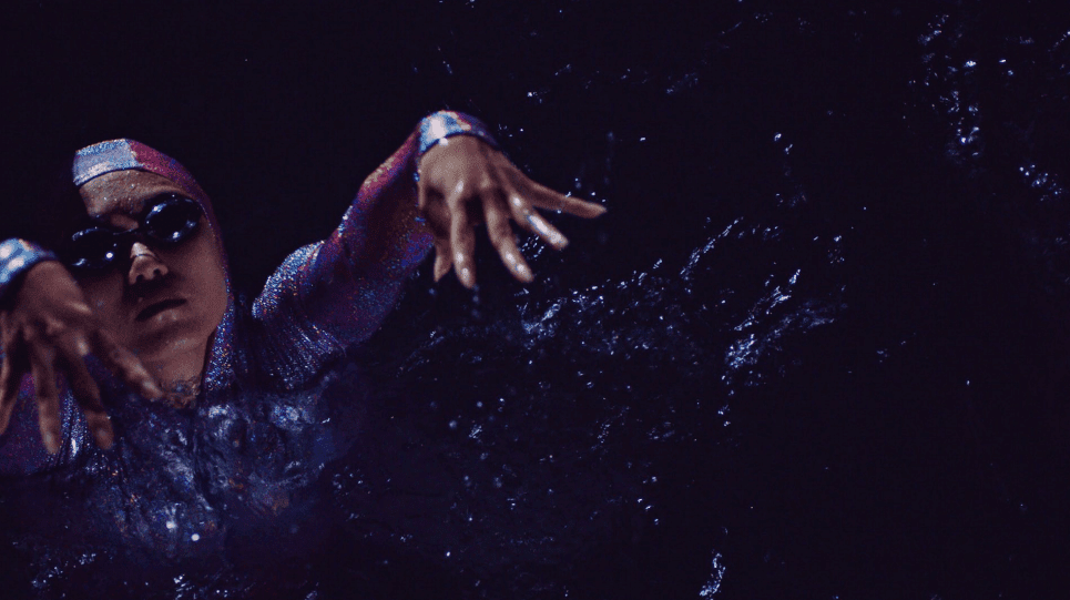 For hundreds of years, the economy of the coastal region was based on decorative pearls, with Al Qadiri’s own grandfather working as a singer on a pearling boat. After the discovery of oil in the twentieth century, a massive transformation took place in the affected societies and this part of history was erased, relegated to popular fiction. The video proposes to bridge that gap through the formal abstraction of colour; it follows the movements of synchronized swimmers wearing dichroic body suits akin to the sheen of both pearls and oil, fully choreographed to a traditional pearl-diving song.