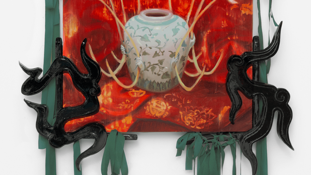 Built from an expanding vocabulary of materials, Nguyen’s paintings take on a sculptural form that extends far beyond the canvas surface. Each work is suspended within elaborate frames made of carved wood, rattan weaving, and cascading lengths of glass beads, pearls and velvet ribbons.